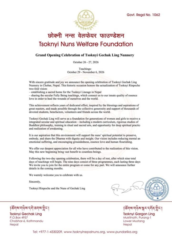 With sincere gratitude and joy we announce the opening celebration of Tsoknyi Gechak Ling Nunnery in Chobar, Nepal. This historic occasion honors the actualization of Tsoknyi Rinpoche two-fold vision: